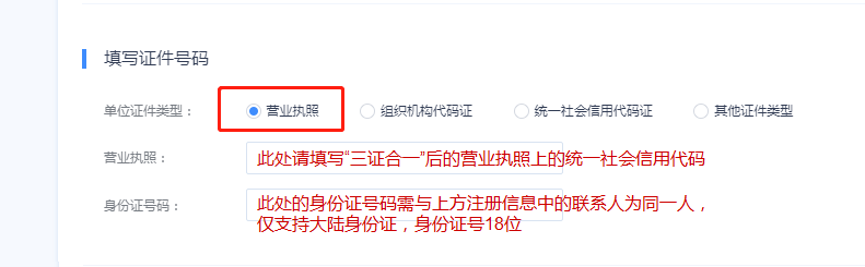 4.用戶類型爲單位,且擁有營業執照(zhào)時,實名認證中的“組織證明類型”請(qǐng)選擇“營業執照(zhào)”。
