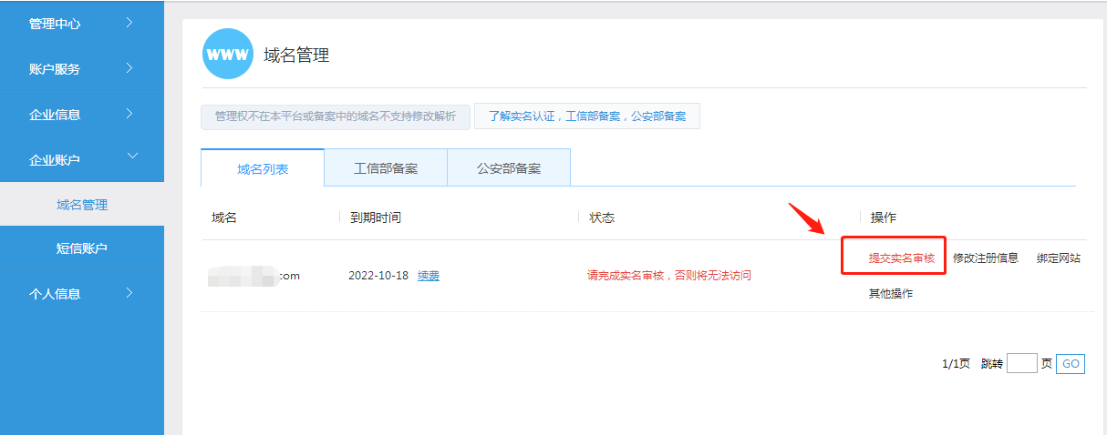 實名審核提交入口: 登錄【企業中心】--【企業賬戶】--【域名管理(lǐ)】