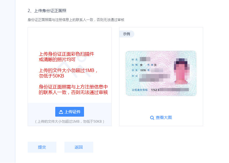 名稱一緻;而用戶類型爲“個人(rén)”的,則需要提供身(shēn)份證正面照(zhào),(個人(rén))所有人(rén)必須與