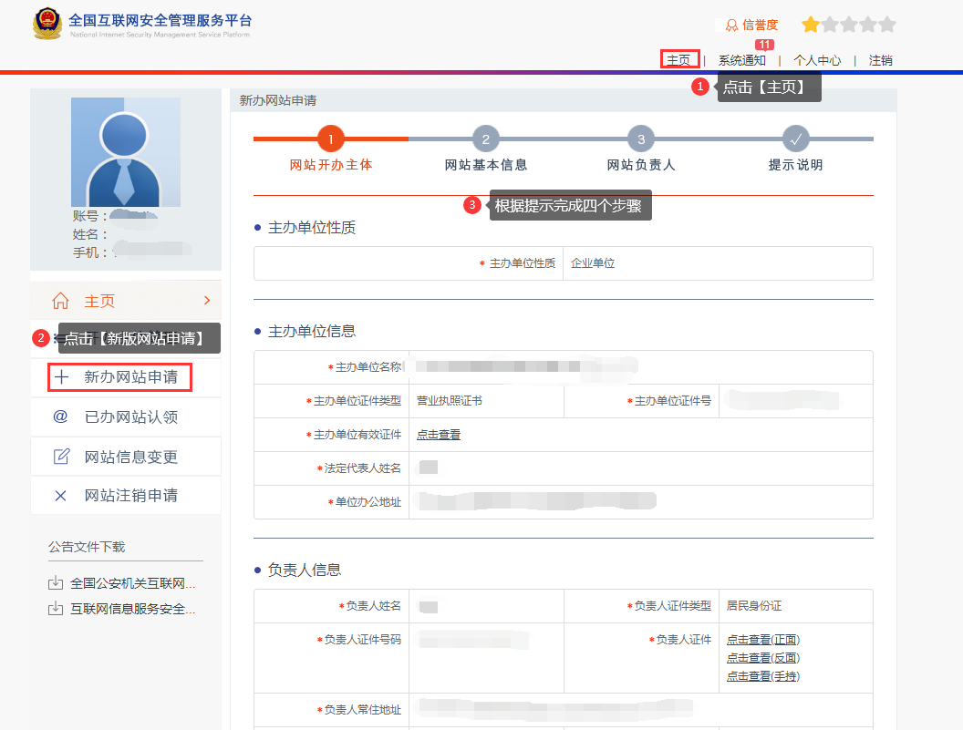 對于首次進行公安部備案的用戶,首先必須填寫主辦單位及負責人(rén)的真實有效信息,隻有提交了主體(tǐ)信息後,才能在該主體(tǐ)下進行網站(zhàn)備案