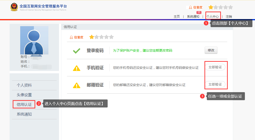 2、注冊完成後登陸您的賬号,登陸後在首頁點擊【個人(rén)中心】進入個人(rén)中心頁面,點擊左側菜單欄【信用認證】,完成其中一項進行驗證或全部信息進行驗證。