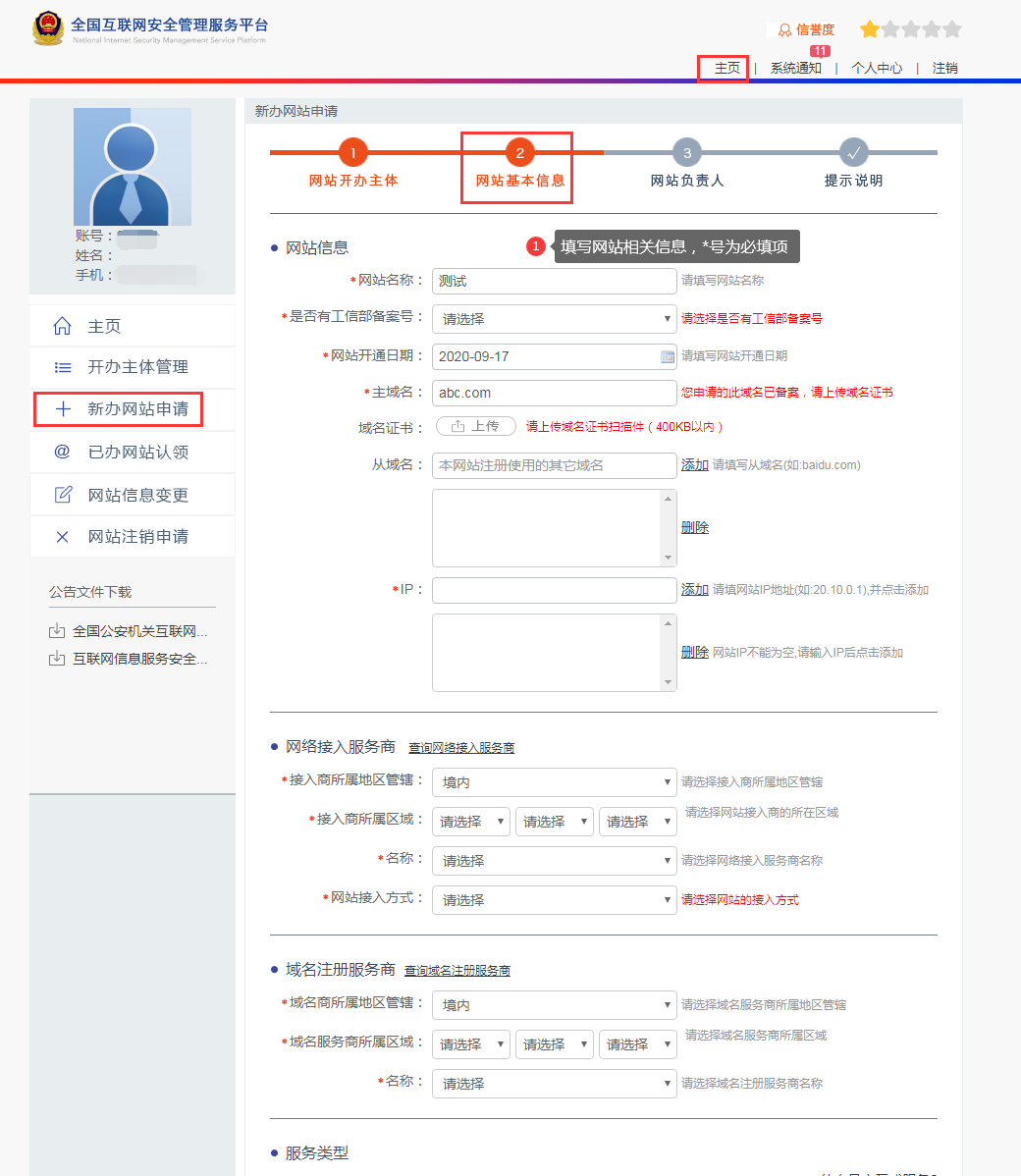 完成網站(zhàn)開辦主體(tǐ)填寫後進入網站(zhàn)基本信息填寫,請(qǐng)根據頁面提示完成信息填寫。信息包括:網站(zhàn)信息、網絡接入服務商、域名注冊服務商、服務類型、互聯網危險物品信息發布、網站(zhàn)語種。