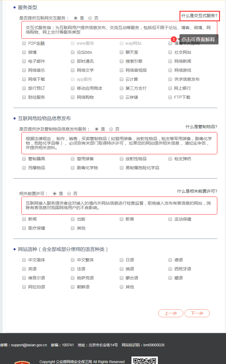 ①-服務類型:單位可(kě)選擇www服務和wap網站(zhàn),個人(rén)可(kě)選擇博客/個人(rén)空間,如(rú)有其他(tā)類型内容可(kě)如(rú)實勾選。(如(rú)無法判斷請(qǐng)往下查看(kàn))